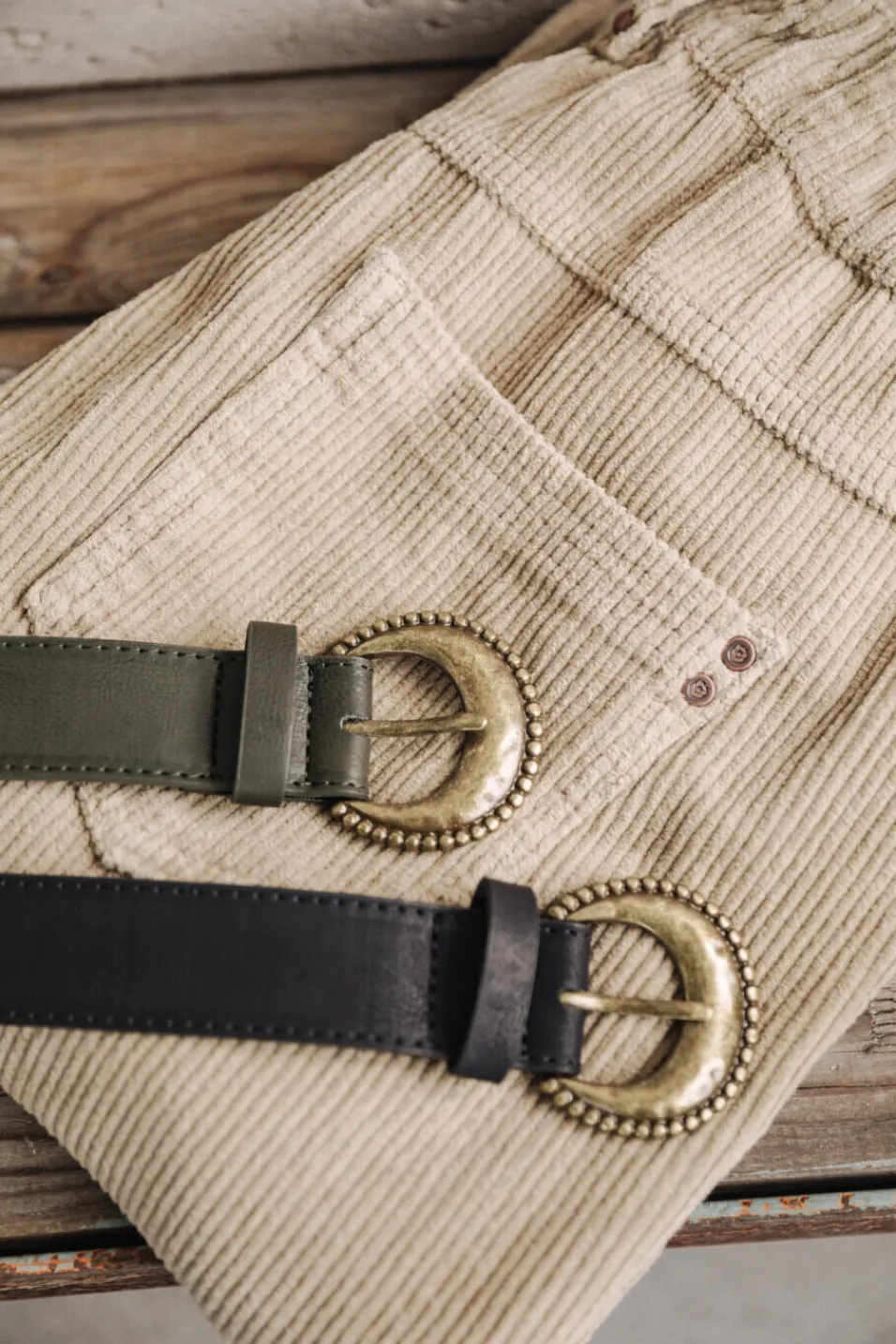 •Ceinture en cuir agrémentée de clous en métal doré vieilli serpentant tout du long