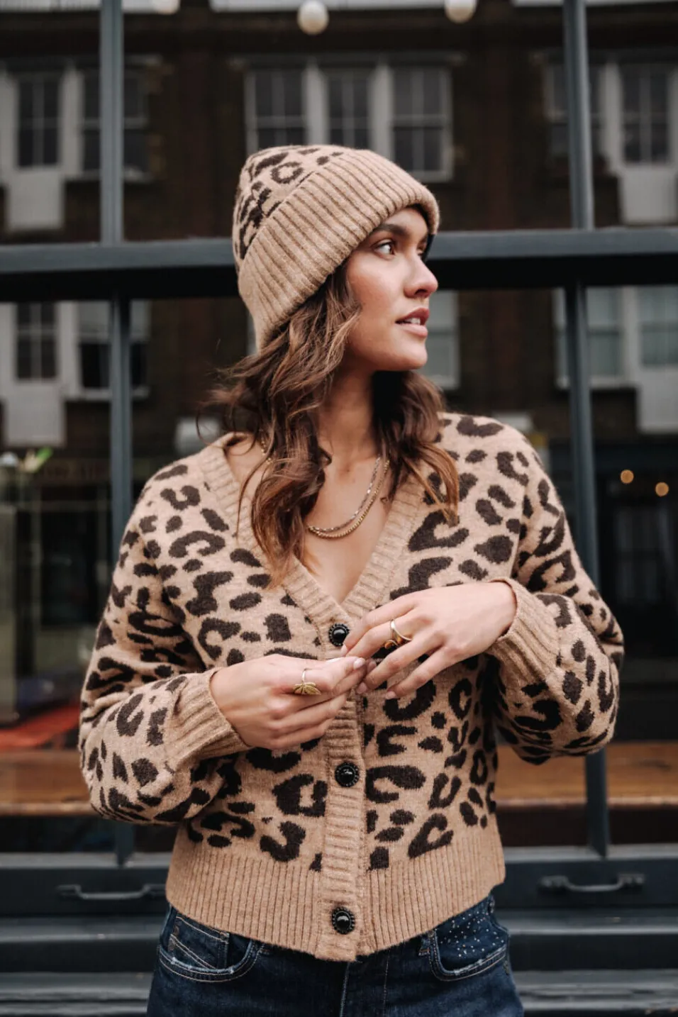 • Bonnet dans une maille douce, jacquard à motif léopard