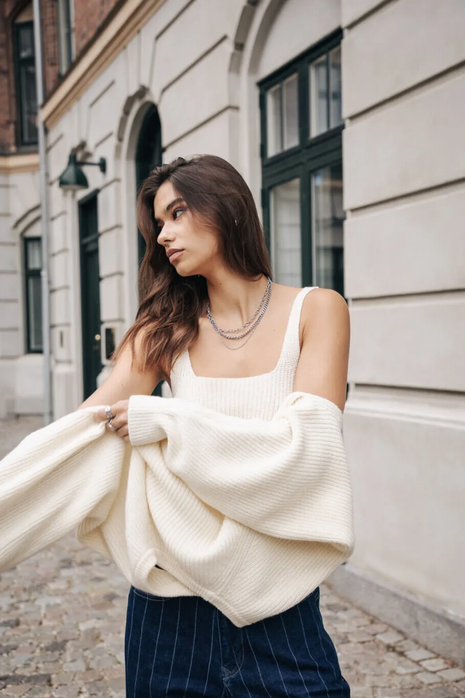 • Croisé sur le devant laissant voir un top À bretelle dans la même maille