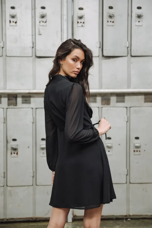 • Robe « cache-cœur », col montant dans un voile uni, léger et fluide