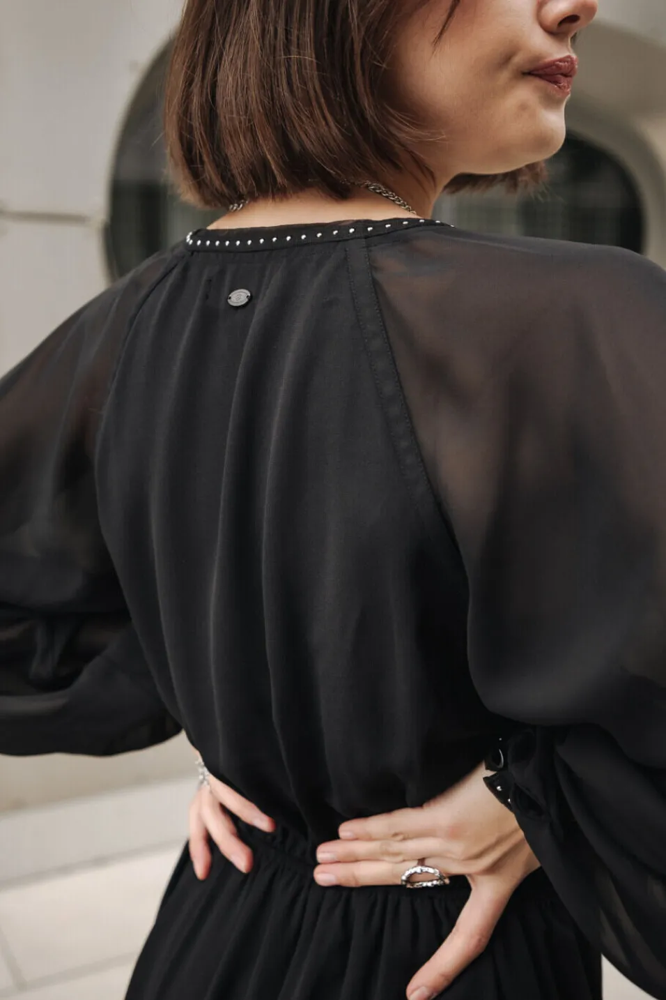 • Détail de galons cloutés le long de l’encolure et sur les poignets