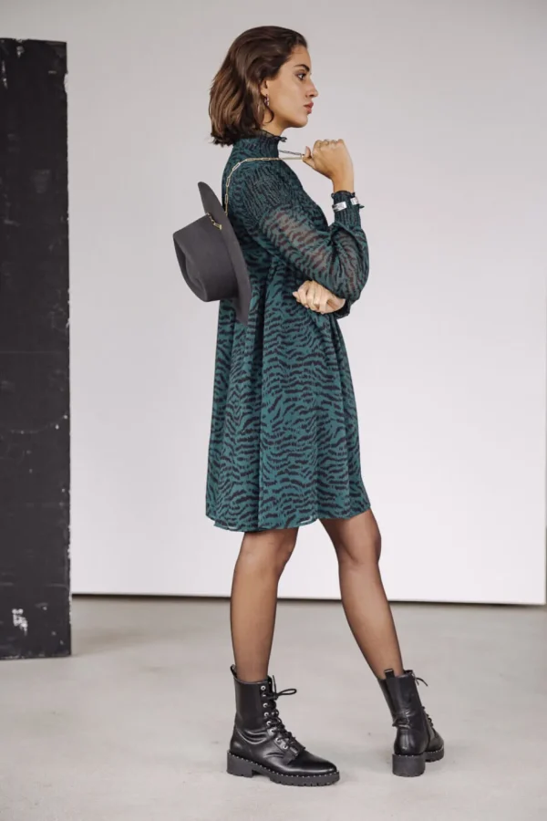 Entièrement imprimée d’un motif zébré sur fond vert canard