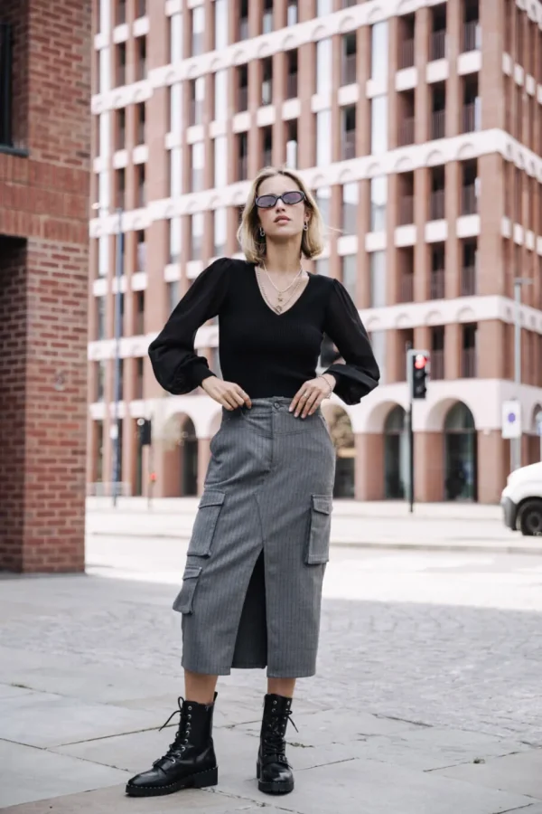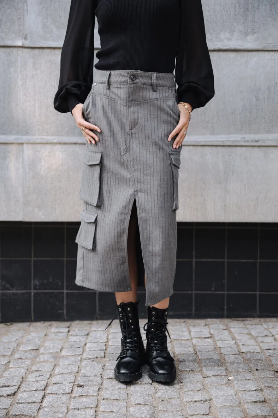 • Matière grise légèrement stretch, toucher doux, à fines rayures