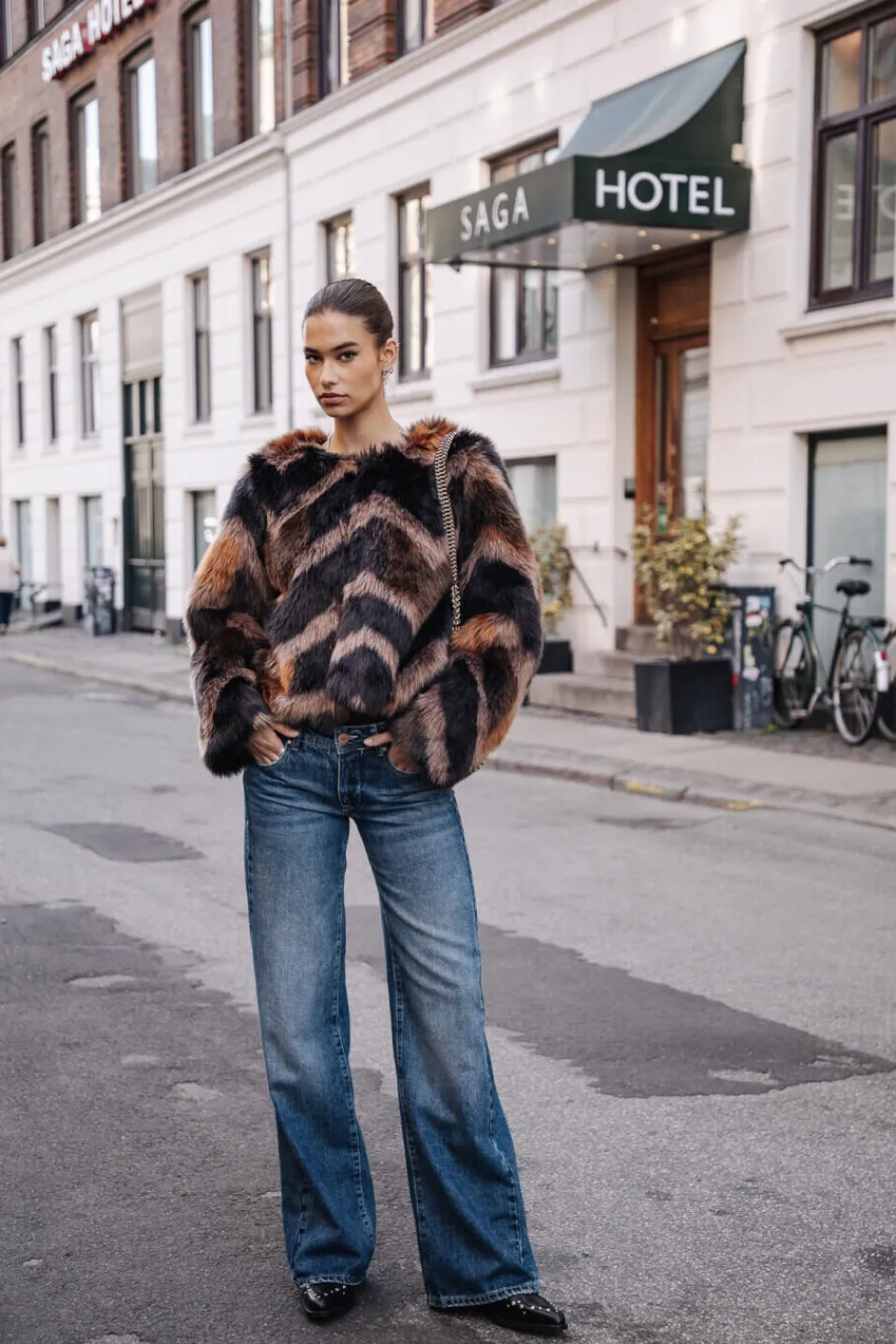 • Veste courte sans col à fourrure à poil mi-long entièrement imprimé d’un motif animal