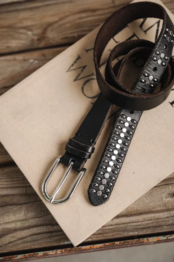 •Ceinture en cuir agrémentée de clous en métal argenté