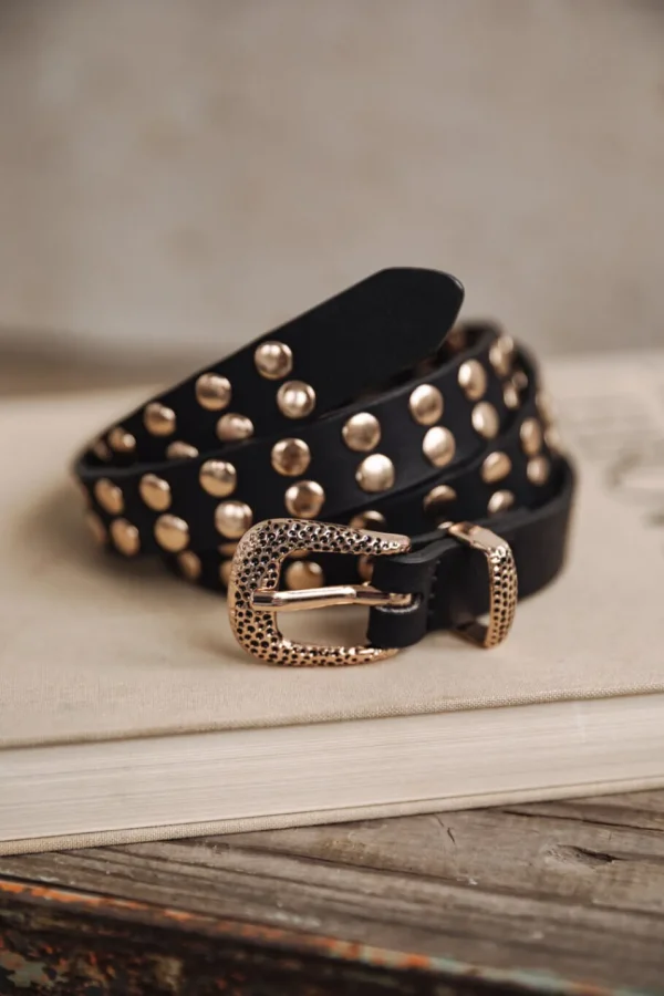 •Ceinture en cuir agrémentée de deux rangées de clous en métal doré
