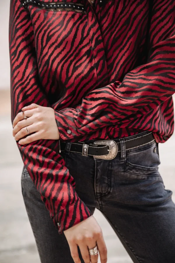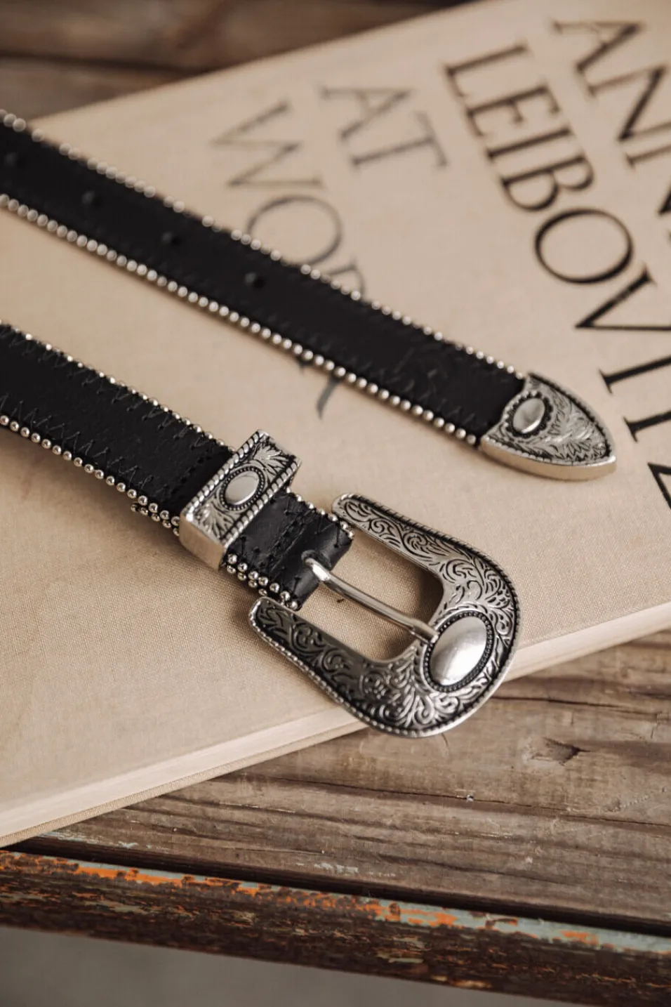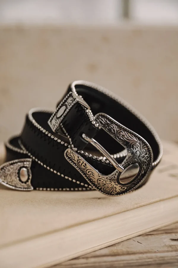 •Boucle, passant et embout en métal argenté d’inspiration western