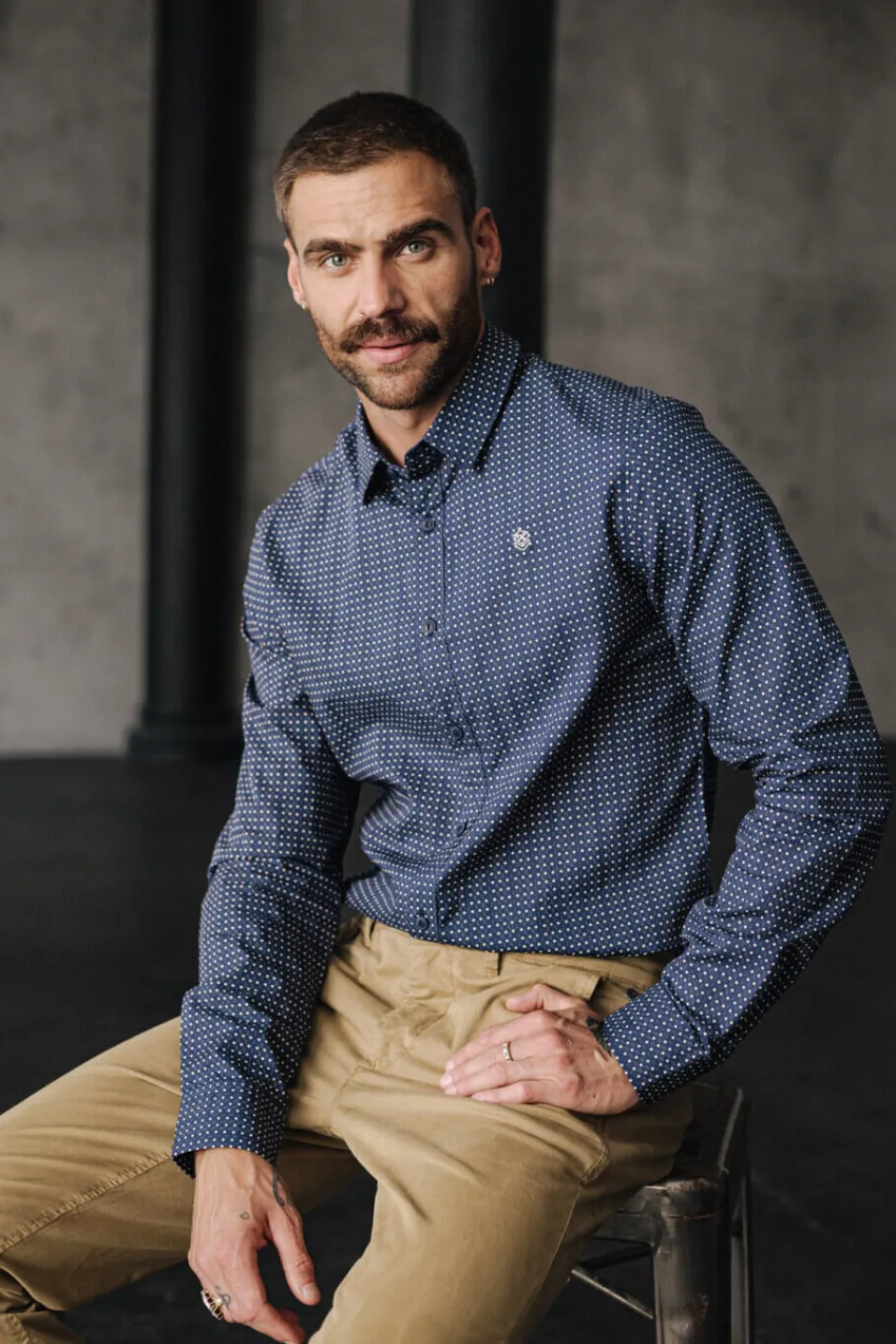 • Matière non stretch,à motif pointillés dans les tons bleu marine et blanc