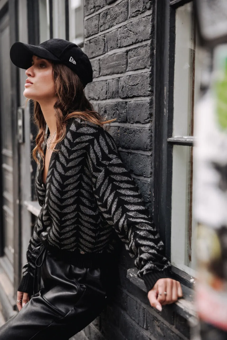 •Gilet à manches longues dans une maille intersia bicolore esprit feuille, douce et poilue