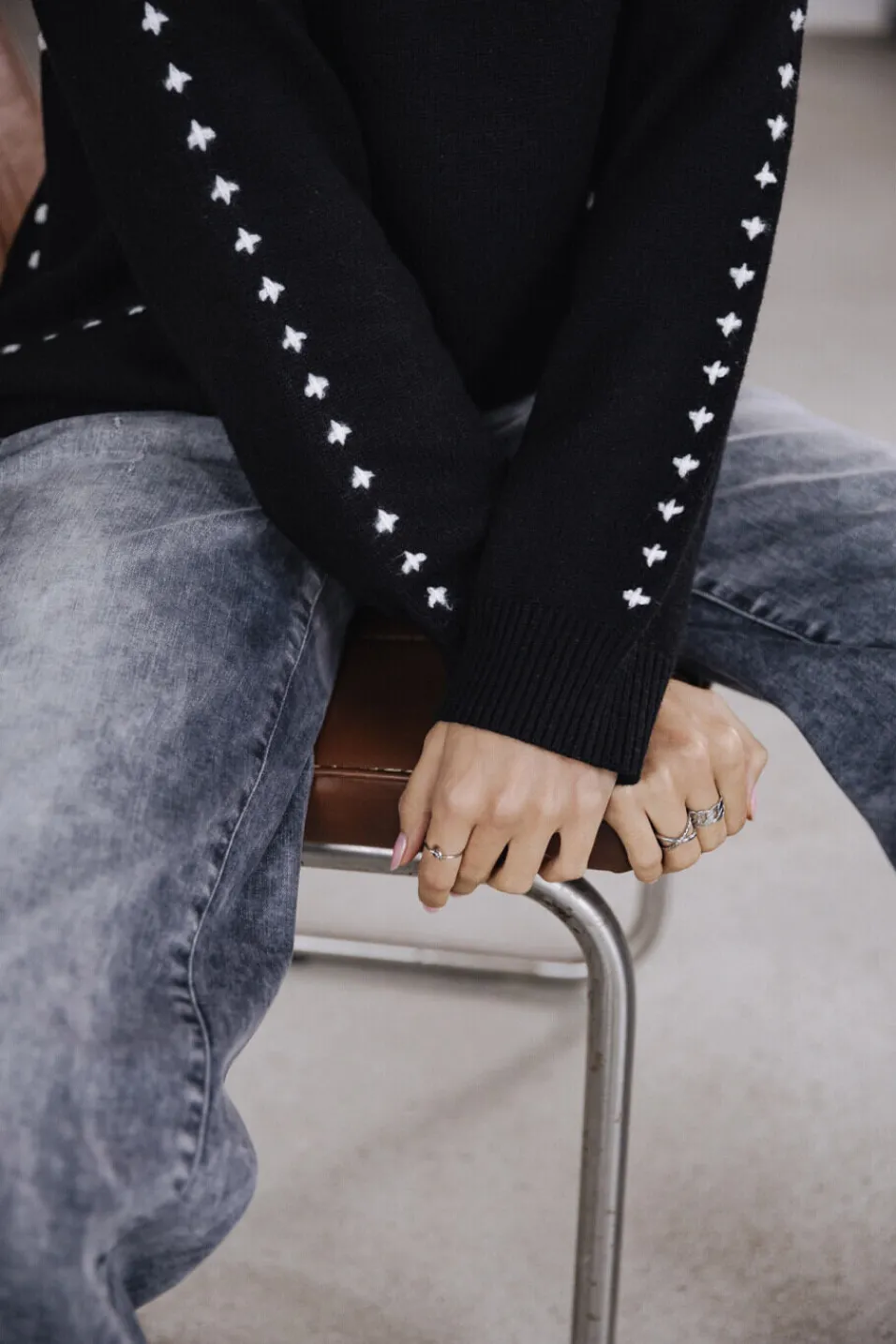 • Pull long col montant dans une maille douce et chaleureuse unie avec détail de broderie sur le corps et les emmanchures