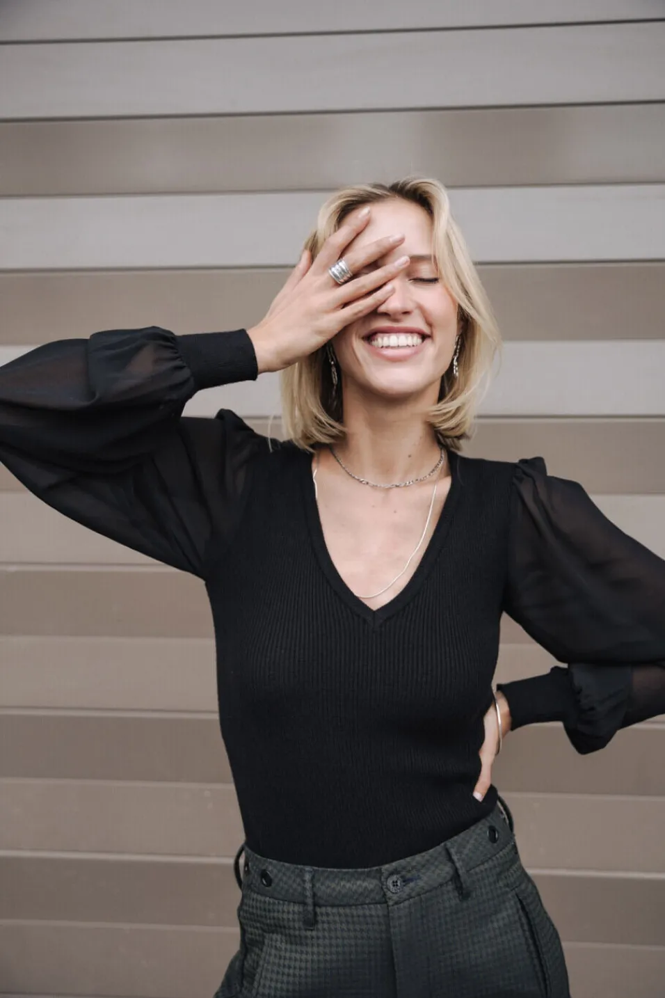 • Pull bi-matière à manches longues dans une maille douce et fluide unie