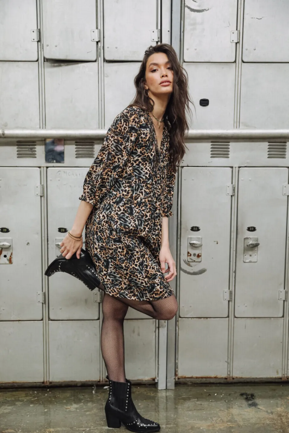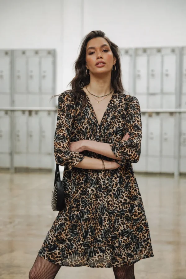 • Robe ample à manches blousantes dans un voile crèpe imprimé léopard