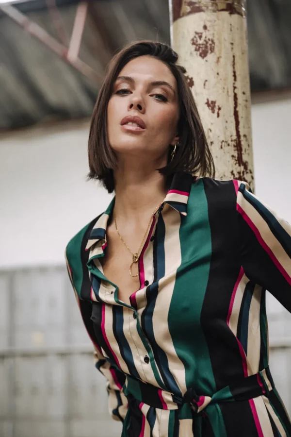 • Robe chemise imprimée rayures multi-couleurs dans une matière satinée fluide et douce