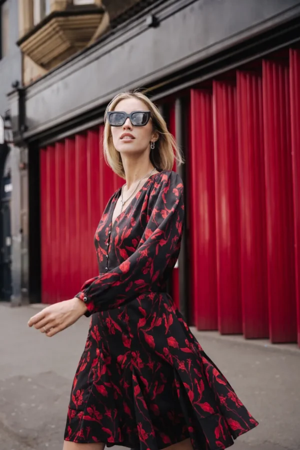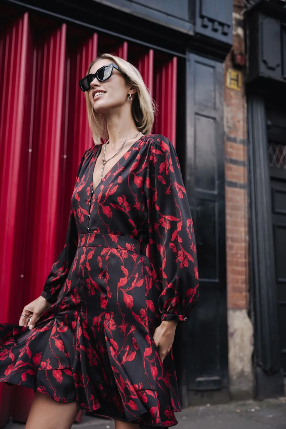 • Robe courte évasée dans une matière fluide entièrement imprimée fleur rouge sur fond noir