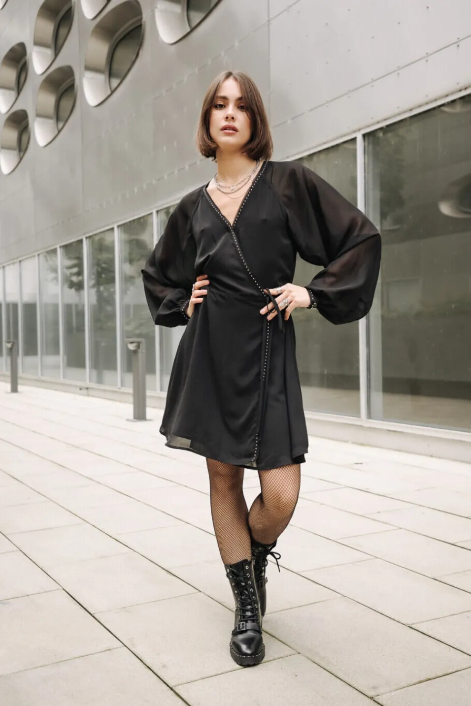 • Robe effet cache-cœur manches longues ressérées à la taille dans un voile légèrement transparent uni
