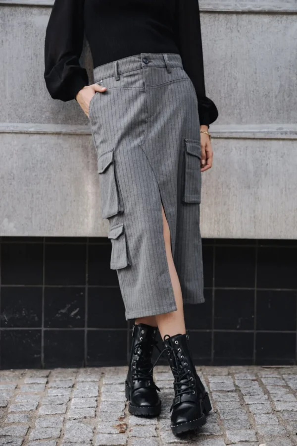 • Matière grise légèrement stretch, toucher doux, à fines rayures