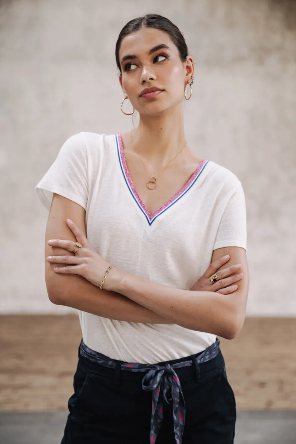 •Décolleté V avec galon fantaisie de couleur contrastée