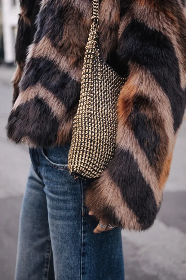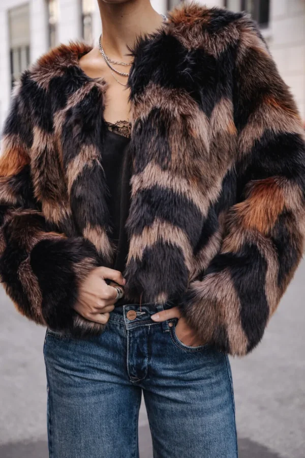 • Veste courte sans col à fourrure à poil mi-long entièrement imprimé d’un motif animal