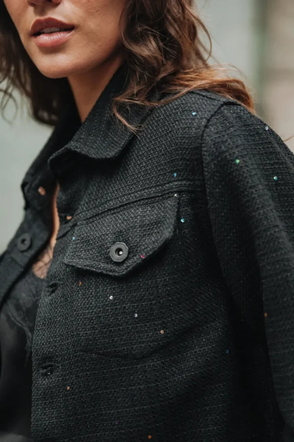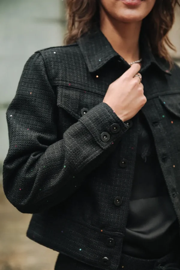 Notre veste Olena Tweedy taille petit, nos stylistes vous conseillent de prendre la taille au-dessus.