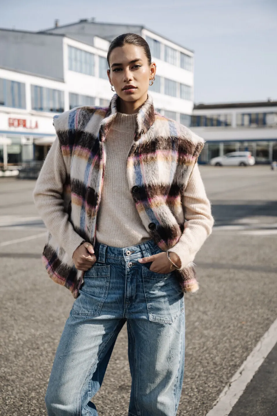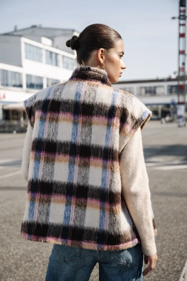 • Gilet sans manches dans un drap de laine à carreaux doux et poilu